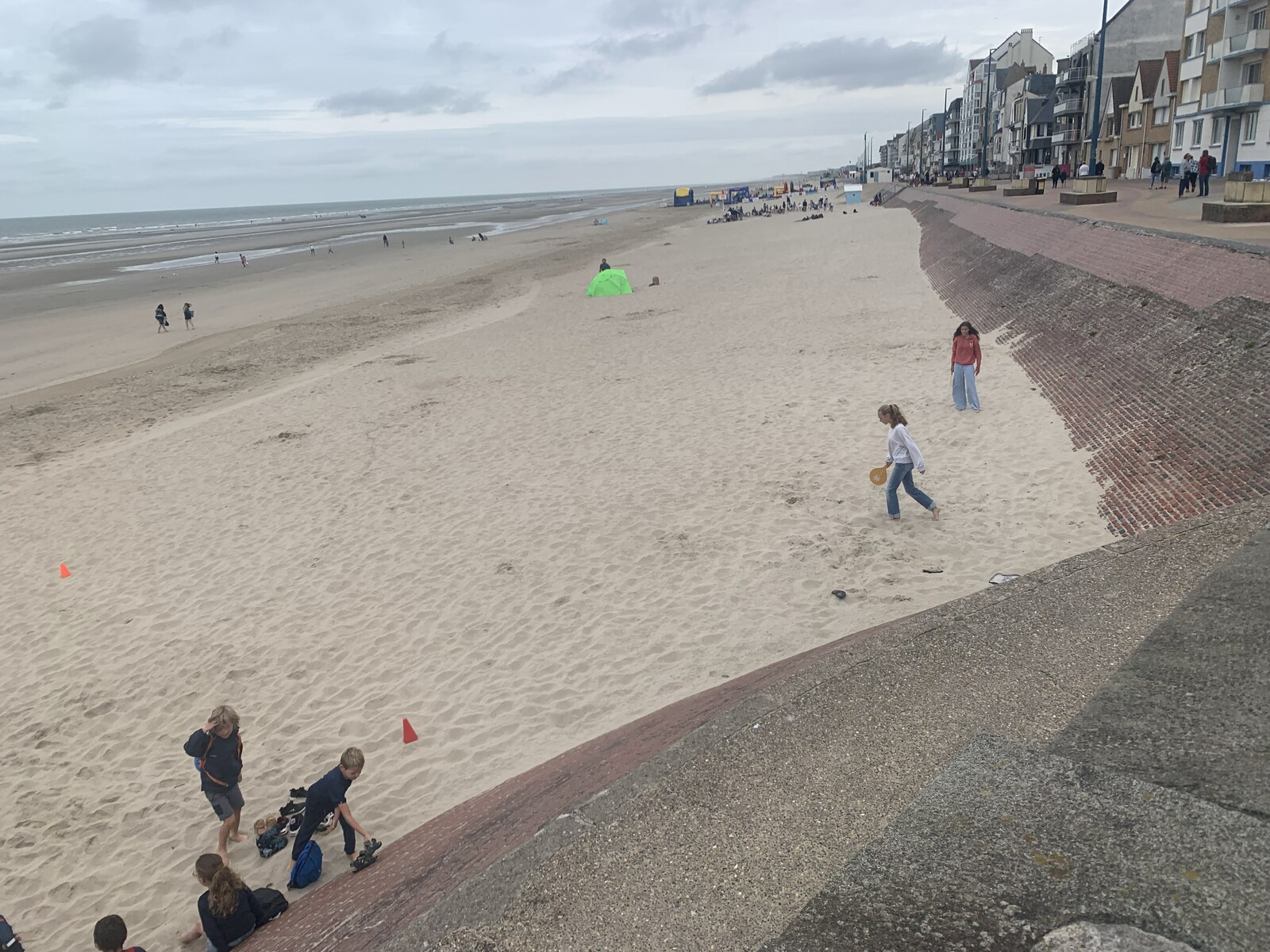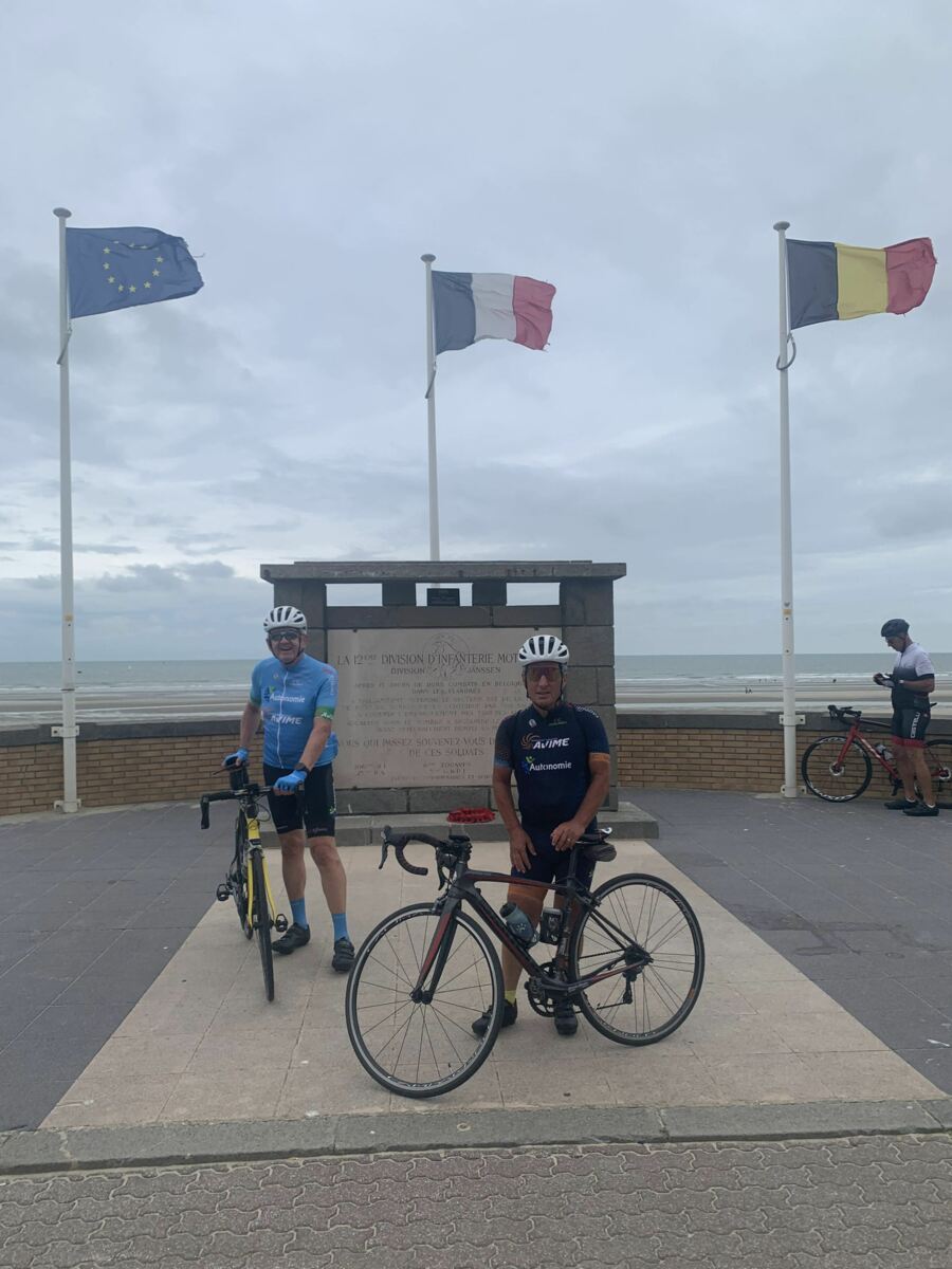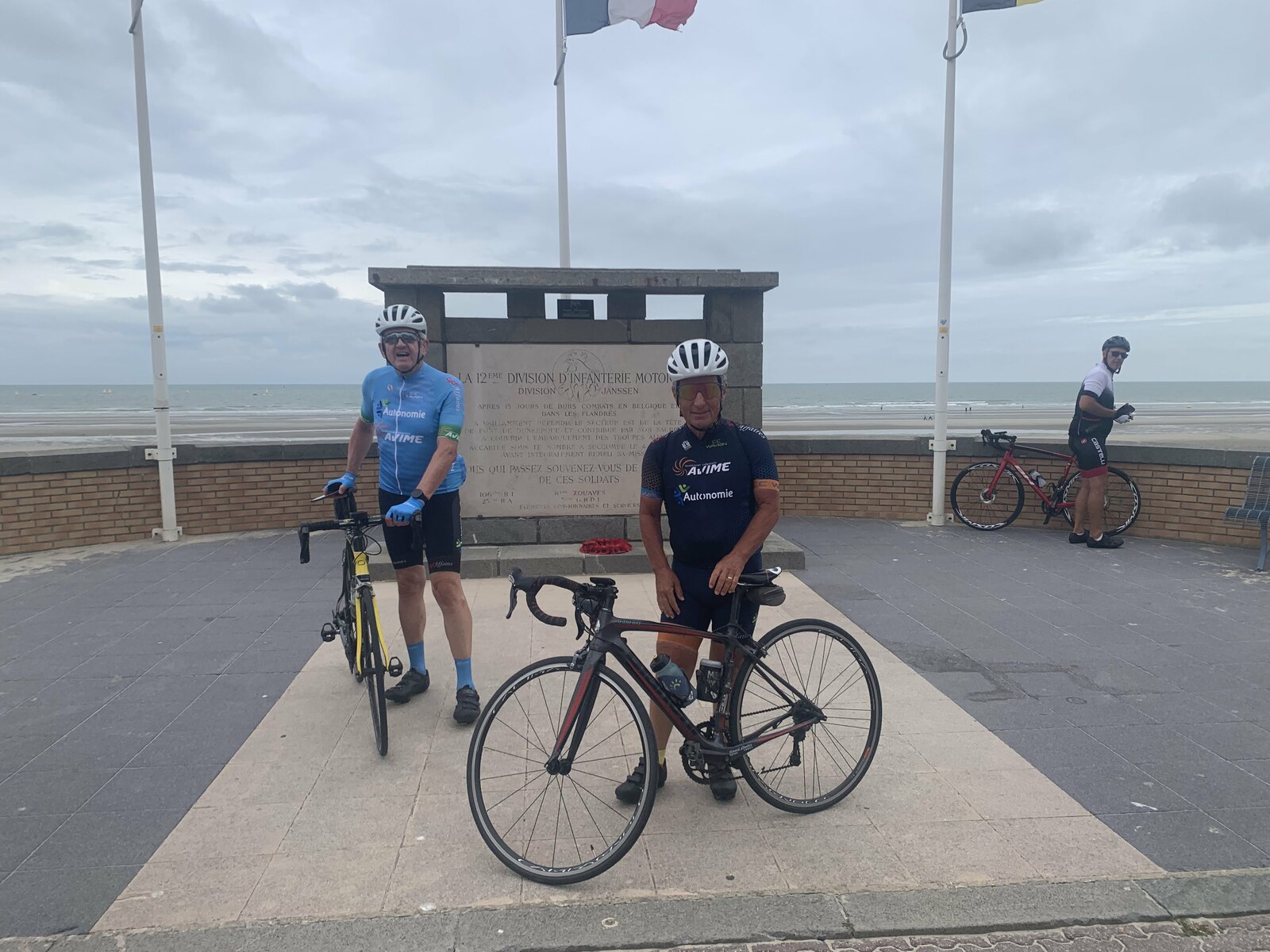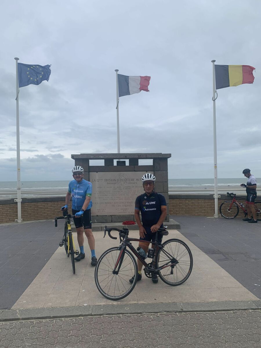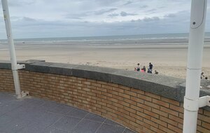 Malgré ces nombreux forfaits, principalement dus à une météo annoncée peu favorable pour le retour, on décida avec Pierre-Gilles de partir. Christian très gentiment se dévoua pour prendre la tête et c’est avec un bon rythme que nous arrivâmes sur le côté du Mont des Cats où Christian prit la direction du retour. Pierre-Gilles prit le relais et à deux nous continuâmes notre progression sans encombre et sans pluie. Il était 11h15 lorsque nous arrivâmes à Ghyvelde lieu de notre restaurant qui n’ouvrait pas avant midi. On en profita pour prolonger notre périple jusque Bray-Dunes et y faire la traditionnelle photo devant la mer.